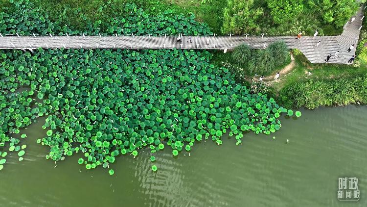 △陜西漢中天漢濕地公園內(nèi),游人穿行,荷影婆娑。(總臺(tái)記者劉海濤拍攝)