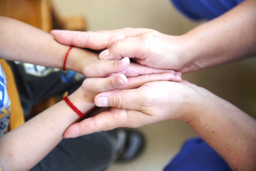 在經過小兒運動治療室時,娜沙停下腳步,從包里掏出一把還未吹起來的彩色氣球。她來到孩子們面前,直接跪在地上和他們說起話來,這里的孩子全部都是腦癱兒。一名穿著黃色上衣的小男孩蹣跚著主動上前要獻吻娜沙,娜沙趕緊湊近享受這一香吻時刻。