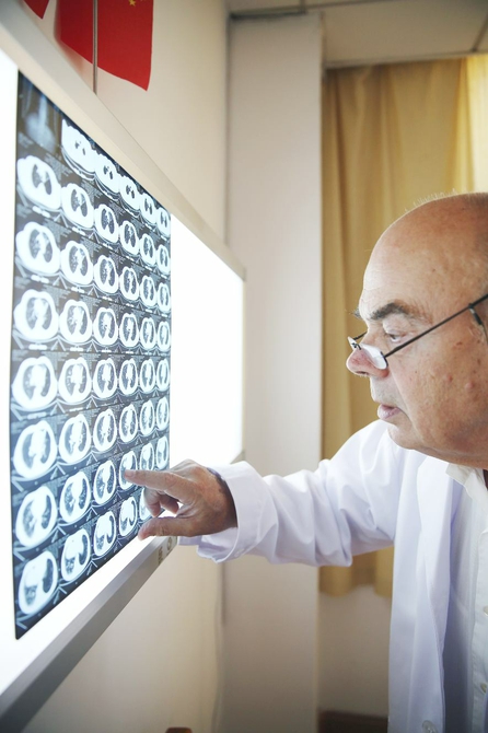 在同一層樓的腫瘤科門診,一位就診者正通過翻譯與米勒溝通著,米勒詳細詢問著這位患者之前吃過什么藥,吃了多久,吃后有何反應等。他帶著老花鏡,時不時地在紙上寫著,最后他通過翻譯告訴這位患者,停掉之前的一種藥,換上另外一種,因為之前的那種副作用太大。